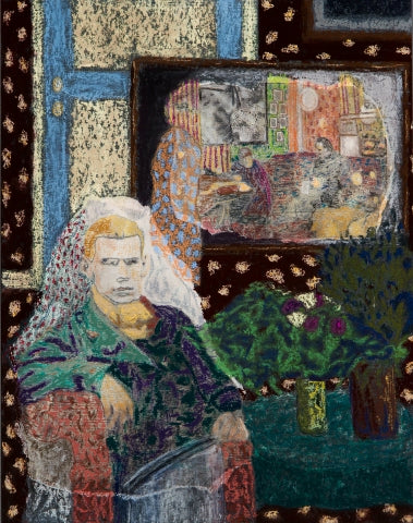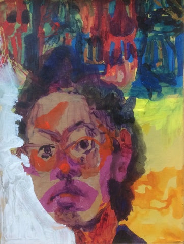 Mickayel Thurin, Self-Portrait, mixed media on paper, 18" x 13.5"