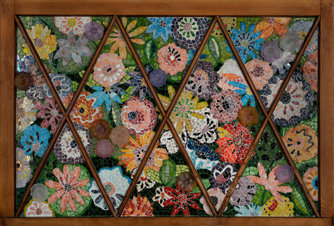 Greens of Summer, mixed media mosaic on repurposed window, 31" x 49" x 1"