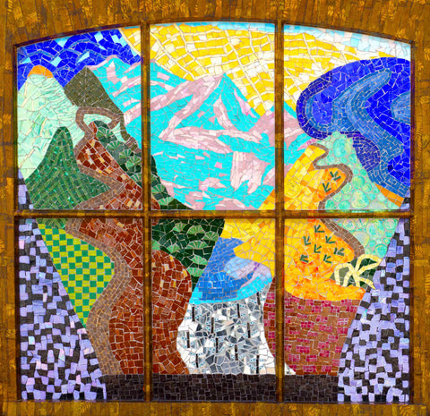 Mountain View, mixed media mosaic on repurposed window, 38" x 38" x 1" SOLD
