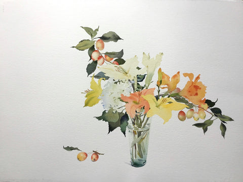 Susan Van Campen, Crabapples with Daylilies, watercolor on paper, H 23" x W 30" SOLD