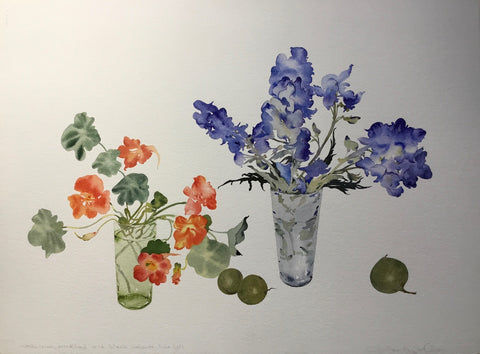 Susan Van Campen, Nasturtium, Monkshood and Black Walnuts, Late Fall, watercolor on paper, H 23" x W 30"