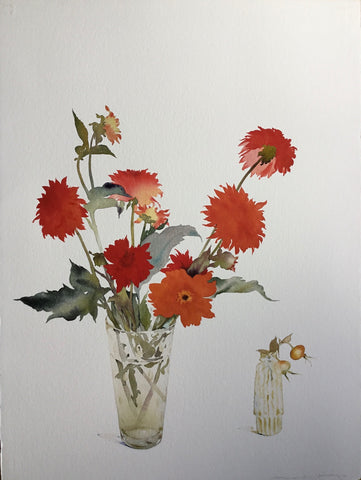 Susan Van Campen, Rosehips and Dahlias, Late August, watercolor on paper, H 30" x W 23" SOLD