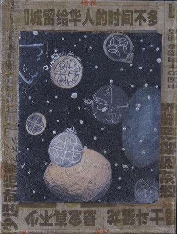 Circles, oil on canvas on panel with self-sourced collage, 14" x 13.5"