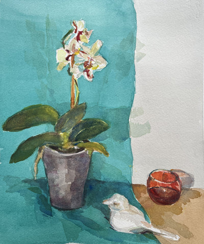 Orchid, Cup and Bird, watercolor, 9" x 12"