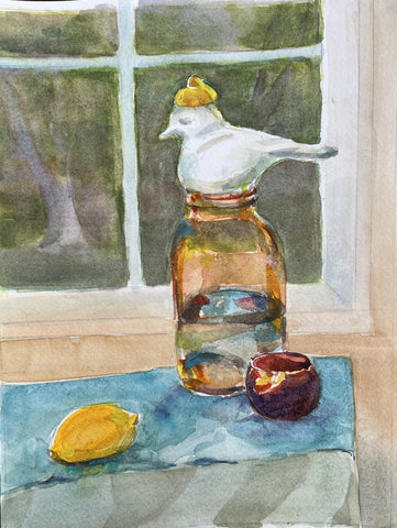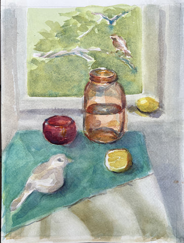 Still Life with Bird, watercolor, 12" x 9"