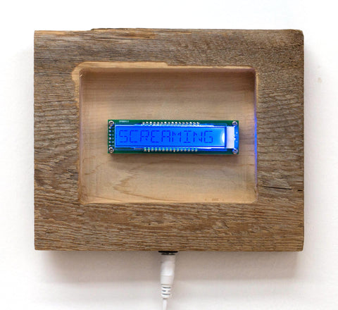 Chris Combs, Blurred Words, LCD display, hardware, circuitry & barnwood, 6" x 7.5" x 1"