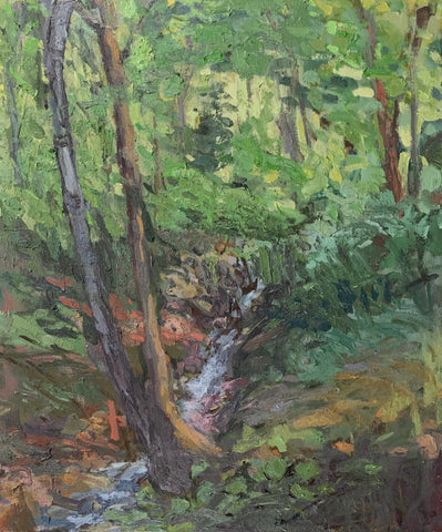 Gretchen Durst Jacobs, Still Water River Bank, oil on board, 10" x 10", THIRD PRIZE RECIPIENT
