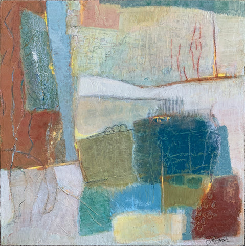 Sandra Koberlein, A Brighter Day I, encaustic, oil stick, collage on birch panel, 12" x 12"