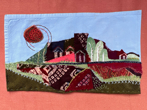 Marlis Kraft, French Village, recycled fabric, beads and embroidery thread, 9" x 14"