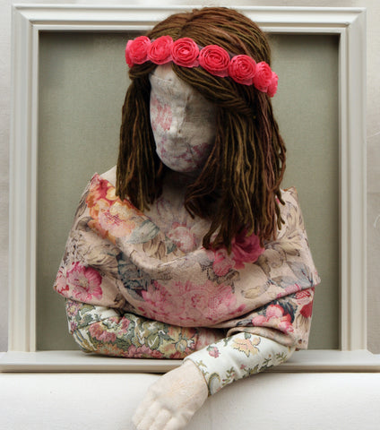 Cindy Winnick, Woman at the Window, mixed media fabric, wire and cotton batting, 16" x 16" x 10"