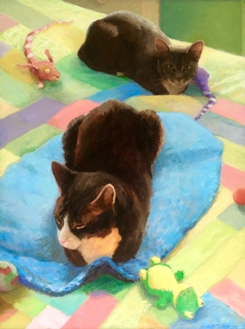 Jeff Thomsen, Two Cats on a Bed, oil on panel, 24" x 18"
