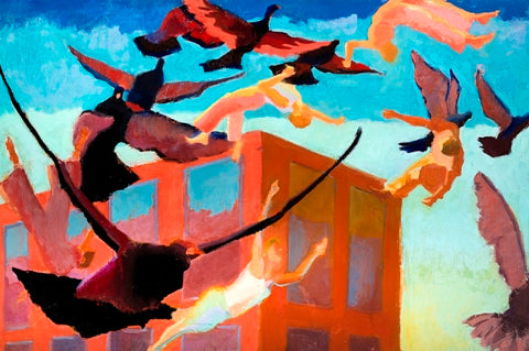Mindy Flexer, Tumbling, oil on canvas mounted on panel, 20" x 30"