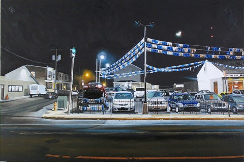 Daina Higgins, Auto Maxx Motors, Ridge Avenue, oil on birch panel, 20" x 30"