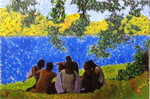Sudyut Sinha, Girls at the Lakeside, acrylic on photograph, 24" x 16"
