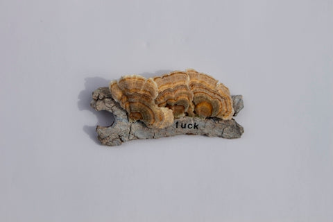 Elie Porter Trubert, Fuck 1, turkey tail mushroom, twig and lettering, 1.5" x 2.5"