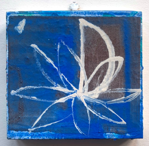 Philippa Beardsley, Blue Flower, acrylic and paper on wood and deconstructed cigar box, 6" x 6.5"