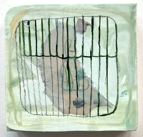 Philippa Beardsley, Staring at the Blinds, acrylic, paper and pencil on wood and deconstructed cigar box, 5 5/8" x 7 3/8"