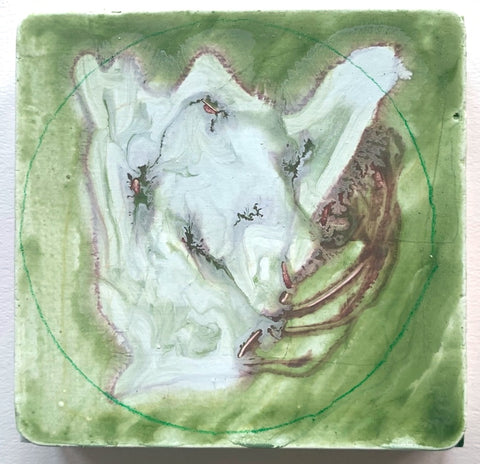 Philippa Beardsley, Untitled (Orange and Green), acrylic and pencil on wood and deconstructed cigar box, 6 7/8" x 8.25"