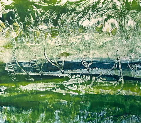 Houses in a Haze, encaustic monotype, 12" x 12"