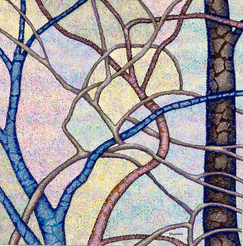 The most recent works are abstractions of the actual - bits of sunsets, icicle formations on rock, invasive tree blossoms. These are created using mixed media - acrylic paint stroked with a 10/0 brush, glass beads and tempered glass which I shatter before affixing atop areas of paint.