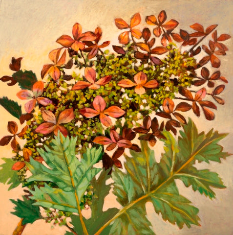 Zahn, Pines and Hydrangeas, mixed media, 16" x 16" Available