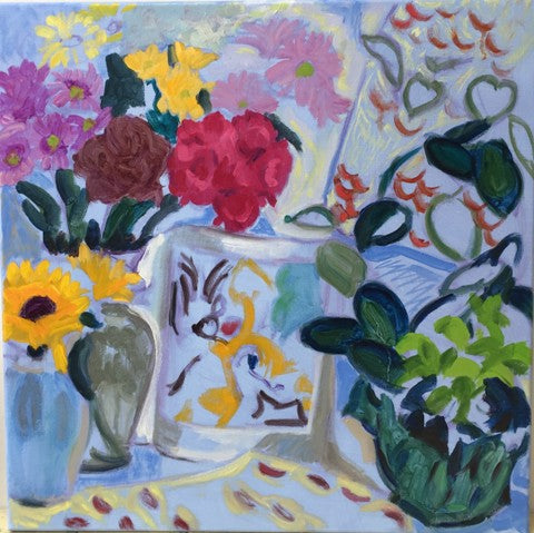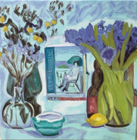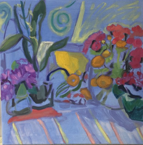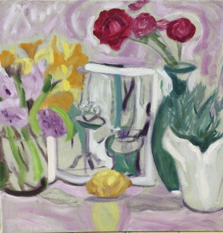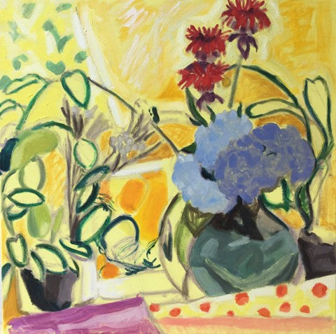 Merves, Daffodils, Lemon & Lavender, oil on flashe ground on canvas, 18" x 18"