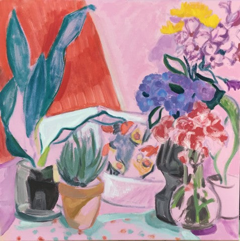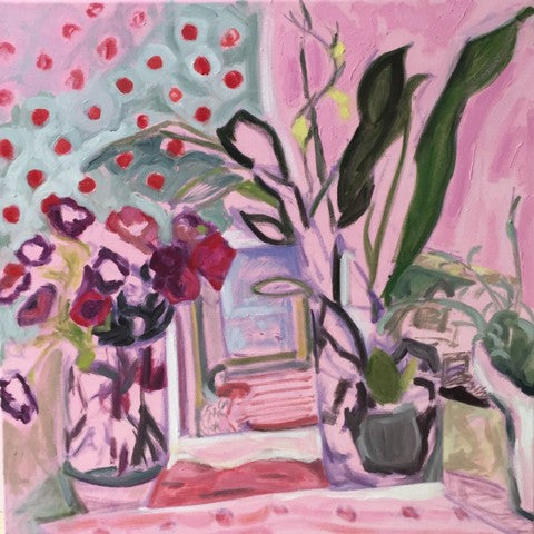 Merves, Polka Dots and Ranunculus, oil on flashe ground on canvas, 22" x 22"