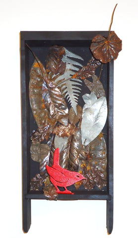 Red Bird in Autumn, found objects, 16.5" x 7.5" x 3" Available