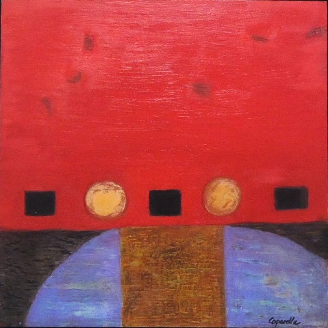 Riveting Red, encaustic paint-stick on wood, 12" x 12"