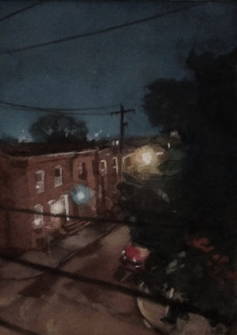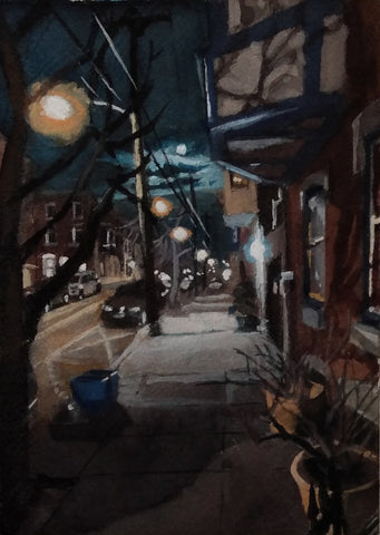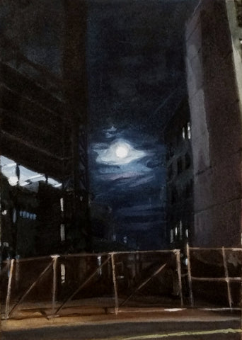 Moonlight Street, ink, watercolor & gouache, 7" x 5" SOLD