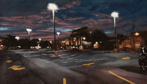 Night Lot, ink, watercolor & gouache, 6" x 10.5" SOLD