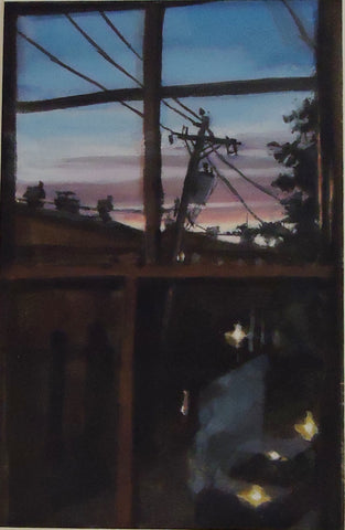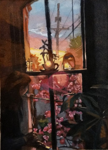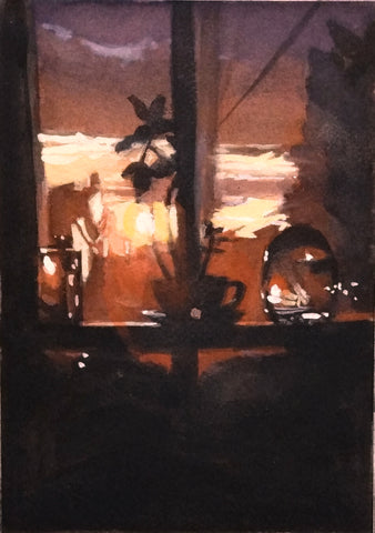 Summer Sunset Window, ink, watercolor & gouache on paper, 7" x 5" SOLD