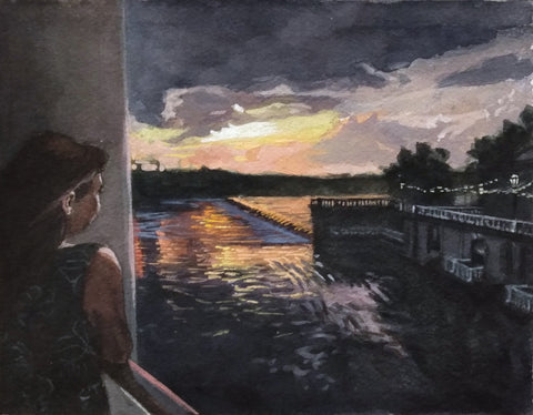 River at Dusk, ink, watercolor & gouache, 5" x 7" SOLD