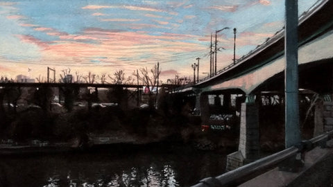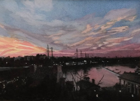 River Sunset, ink, watercolor & gouache on paper, 5" x 7" SOLD