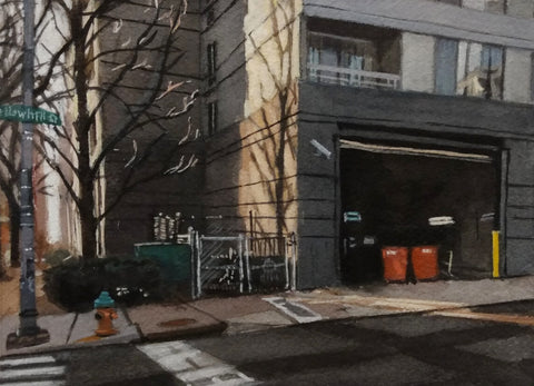 Sunrise Street, ink, watercolor & gouache, 5" x 7" SOLD
