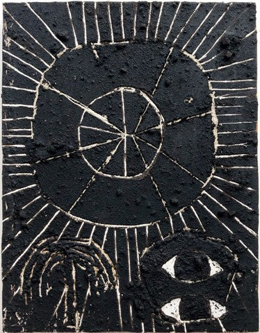 Liza Samuel, Eye Contact, carbonized bone, oil, wax on wood panel, 12" x 10"