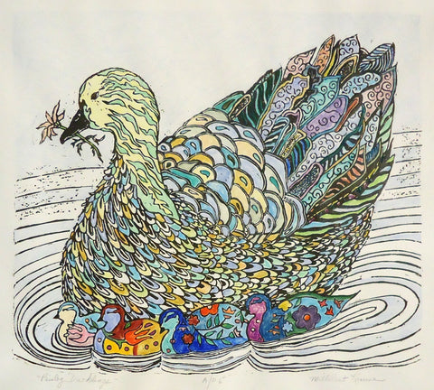 Millicent Krouse, Paisley Ducklings, hand-colored woodblock print, 18.5" x 20" SOLD