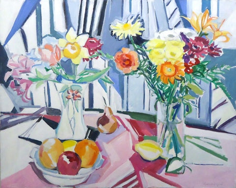 Karen Segal, Still Life with Stripes, acrylic on canvas, 24" x 30" Available