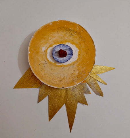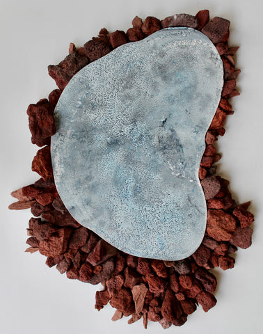 Emily Elliott; Solar Medallion; plaster monotypes with pigment, lava rocks, bronze powder, and paper; 7" x 10" x 2"