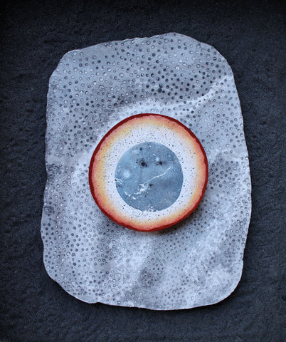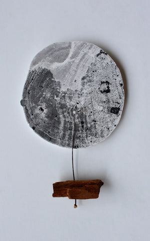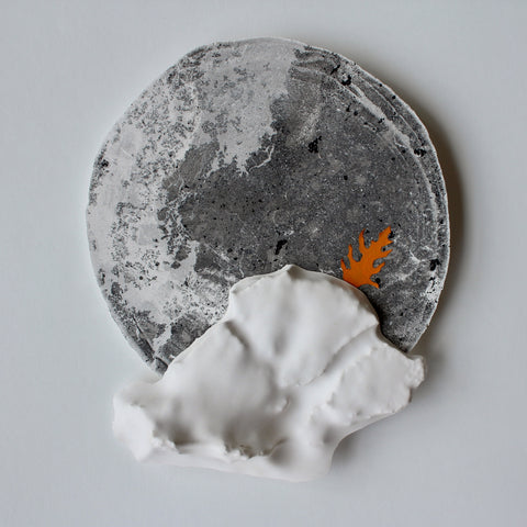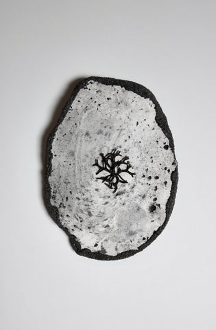 Emily Elliott; Petite Specimen; plaster monotype with charcoal and carborundum, and lichen; 3.5" x 3" SOLD