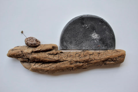 Emily Elliott; Signal Seeker; plaster monotype with charcoal, driftwood, stones, resistor; 8" x 16" x 2"