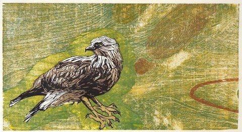 Dan Miller, Forest Sounds, color woodcut print, 9.25" x 17"