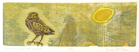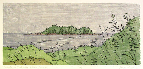 Dan Miller, Western Island above Dunes, color woodcut print, 11" x 24"