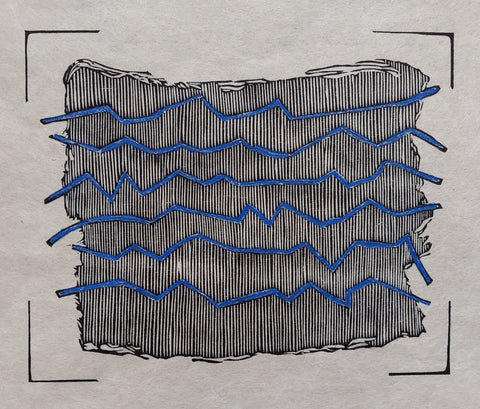 Gene Shaw, Blue Zig Zag, hand-colored woodcut print, 15" x 15.5"