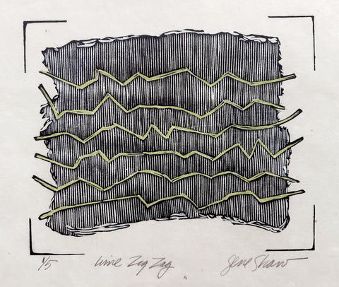 Gene Shaw, Lime Zig Zag, hand-colored woodcut print, 15" x 15.5"