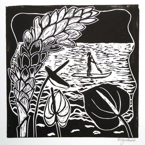 Island Flowers with Paddle Boarder, linocut, 11.5" x 11.5" Available