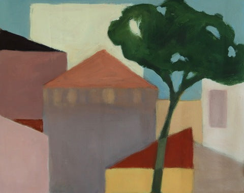 This series of acrylic paintings highlight aspects of the urban landscape of Philadelphia and its suburbs where I live. When I find a particularly compelling composition in either suburban or urban scenes, one that has some element that I find interesting-how a pine tree looks silhouetted against a bright sky or how roads, bridges and ramps crisscross and create movement, I take photos. Back in the studio, I interpret the scene in acrylic paint. Sometimes, I make several paintings of the same scene, asking what happens if I change up the palette or focus on a different part of the scene. As a former art history major with a concentration in architecture, I appreciate the contrasts between the historic buildings and the modern. Along the Schuylkill River in Philadelphia, there is a lively interplay of form and line between the old and new buildings and the bridges and roadways. In the suburbs, hard edged structures like sheds, water towers and houses coexist and stand in contrast with pockets of nature.