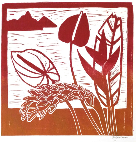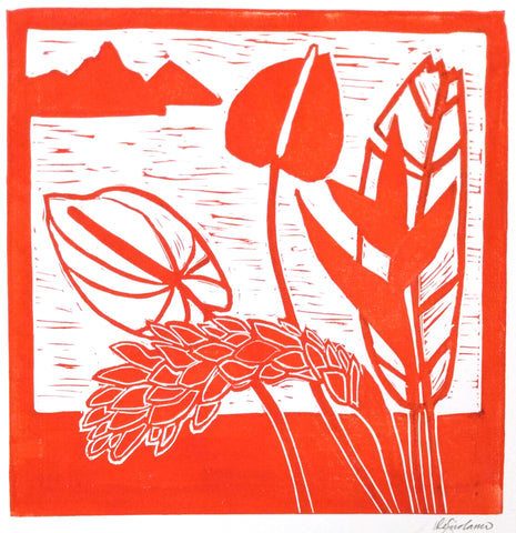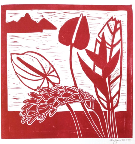 Tropical Flowers Red, linocut, 11.5" x 11.5" Available