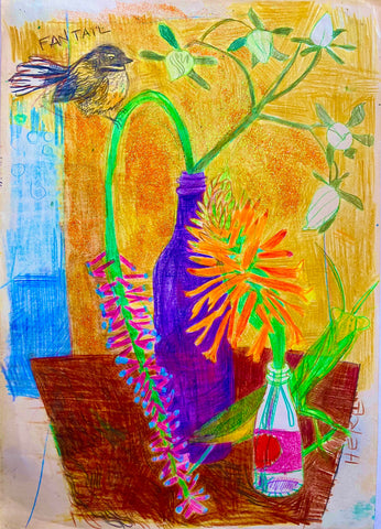 Jessica Levine, Portrait of the artist as a young praying mantis, in residency in sub-tropical Wharepuke, New Zealand, mixed media including artist-made foraged inks printed on canvas, 12" x 10"
