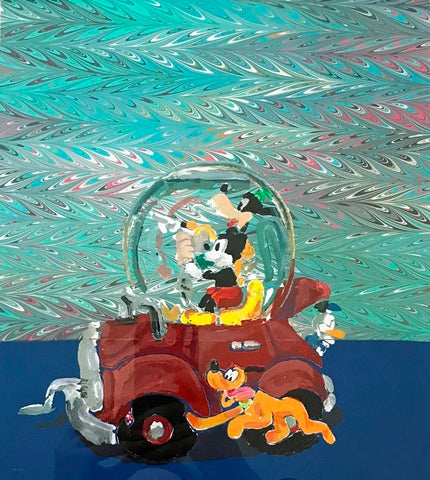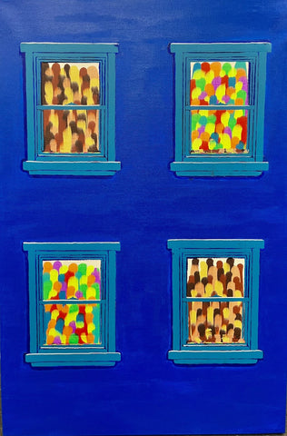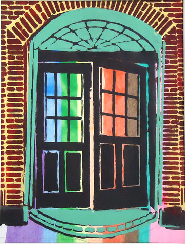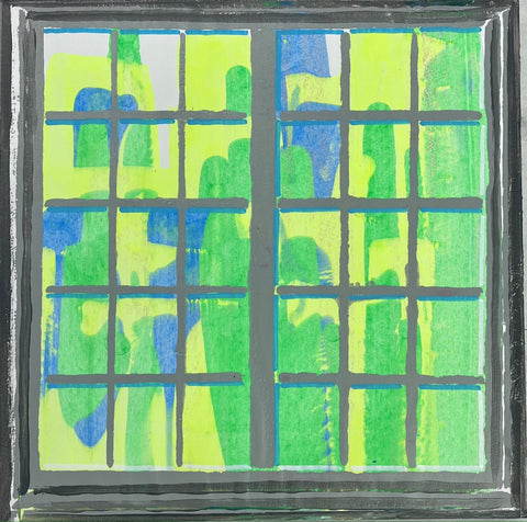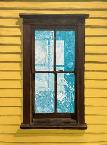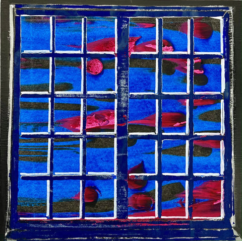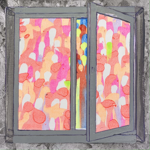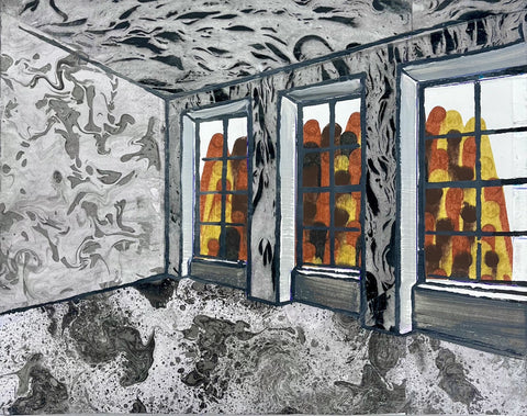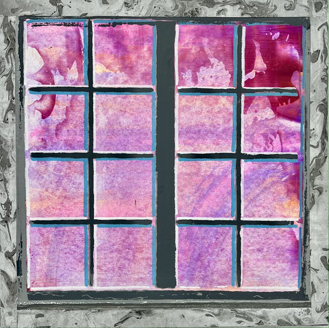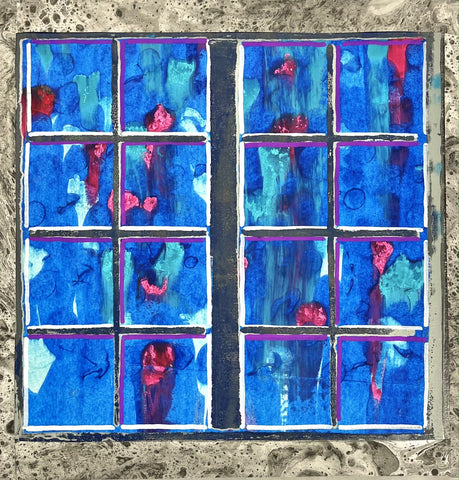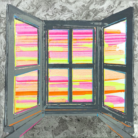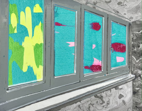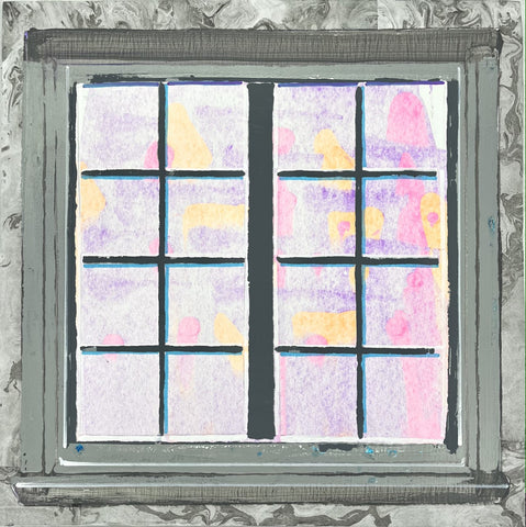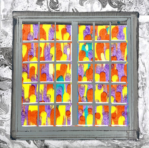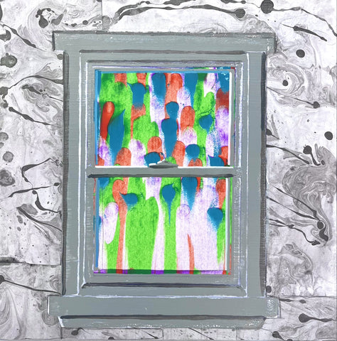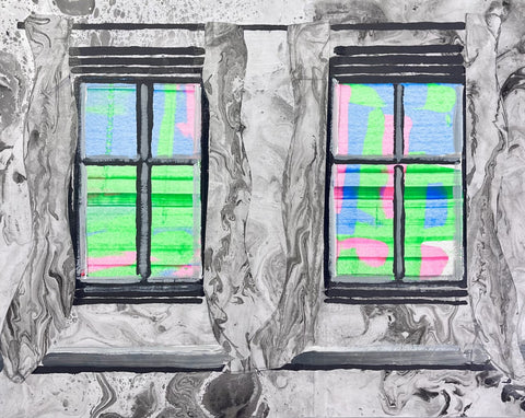 This new series of paintings and prints focuses on the visual motifs of windows. Motivated by metaphors like peering through the windows of other’s experiences, this group of work presents views that look out on celebrations of color and organic paint flows. Contrasting these parties of light with grey toned marbled paper, is my attempt of visually grappling with the notion of people claiming, that “they don’t see color” as a tactic to reassure others they aren’t racist. By holding onto declarations such as these, these individuals miss out on the diversity of life experiences, identities and journeys of folks who are different from them. Choosing to rather exist in a limited space of understanding. These frozen stone interiors depict, one way window watching, where painted representations for celebration of diversity and identities exist beyond comprehension and inclusion, just out of reach for full participation. But close enough to view in judgement.